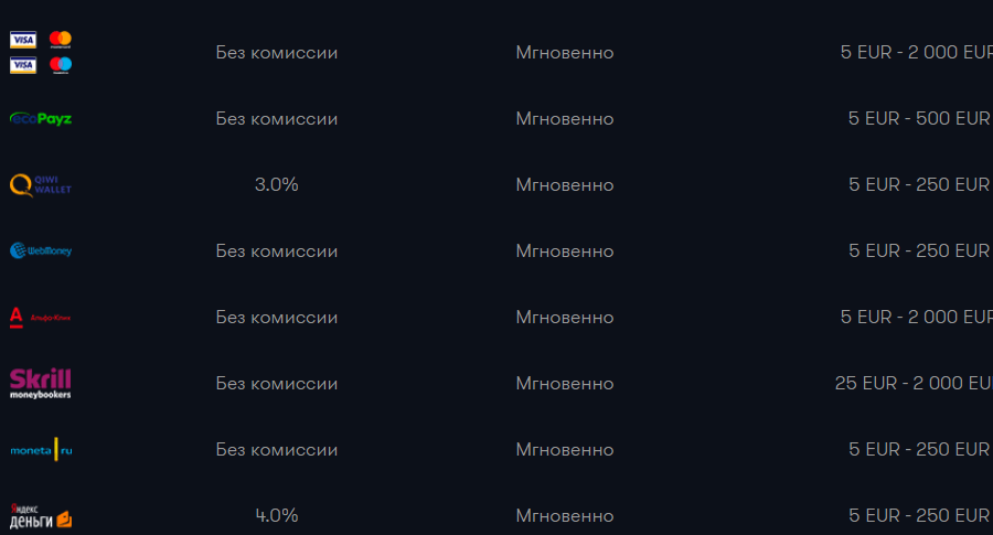MasterCard, Visa, WebMoney, Yandex.Money, Скрилл, МонетаРу, Киви