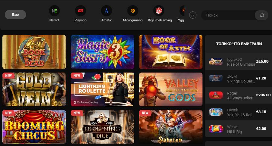 • Игры:Игровые автоматы, рулетка, блэкджек, живые дилеры