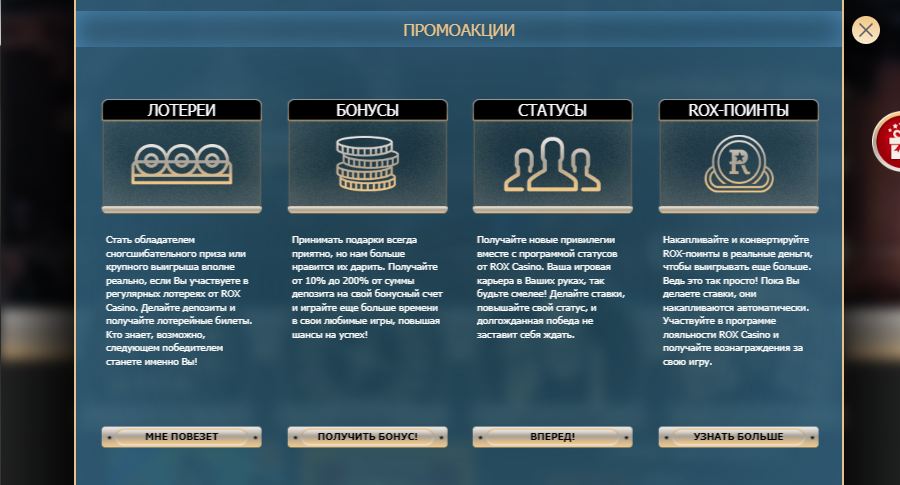 Всего существует 6 статусов для каждого гостя. Нью, Регуляр, Гранд, Премиум, Вип и Элит. Чем выше статус, тем больше выгодных предложений получает клиент, и тем ниже вейджер их отыгрыша. Есть к чему стремиться, неправда ли? А если вспомнить о регулярном кэшбеке (до 10% от проигранных средств), то сразу становится понятно – клуб Рокс один из самых щедрых и лояльных по отношению к своим посетителям.