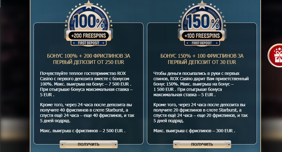 Бонусов в клубе ROX предостаточно – игорный дом относится лояльно к каждому клиенту, будь то новичок, впервые попавший на сайт, будь то завсегдатай заведения. Бездепозитного буста тут нет, за то существует целая линейка вознаграждений на первое пополнение счета: